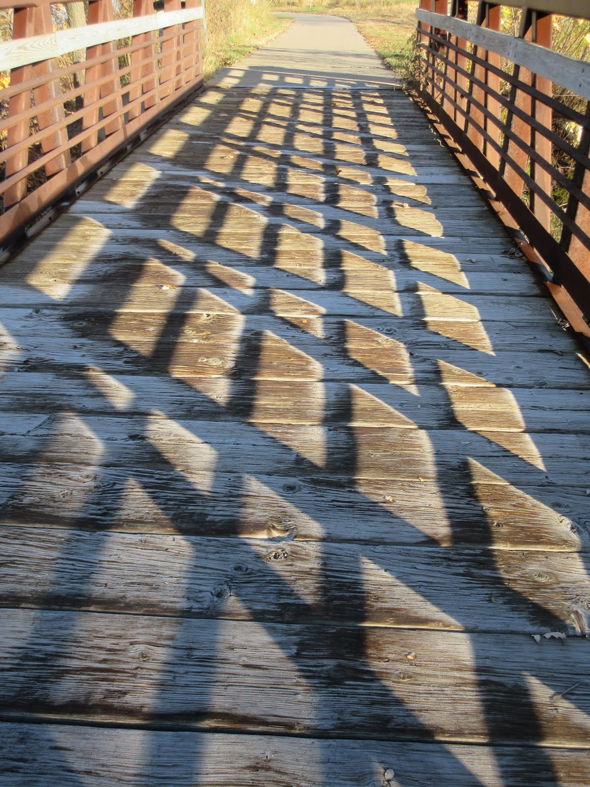 With the temperature just on the critical edge, the morning sun burns off the frost where it touches but not in shadows yet. At the bottom and left of each shadow runs a narrow line where the rising sun has moved to touch the frost but not quite yet melted it away.