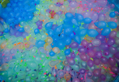 A rainbow cluster of hundreds and hundreds of water balloons, all of which will be thrown in about two minutes of frenzied child activity.