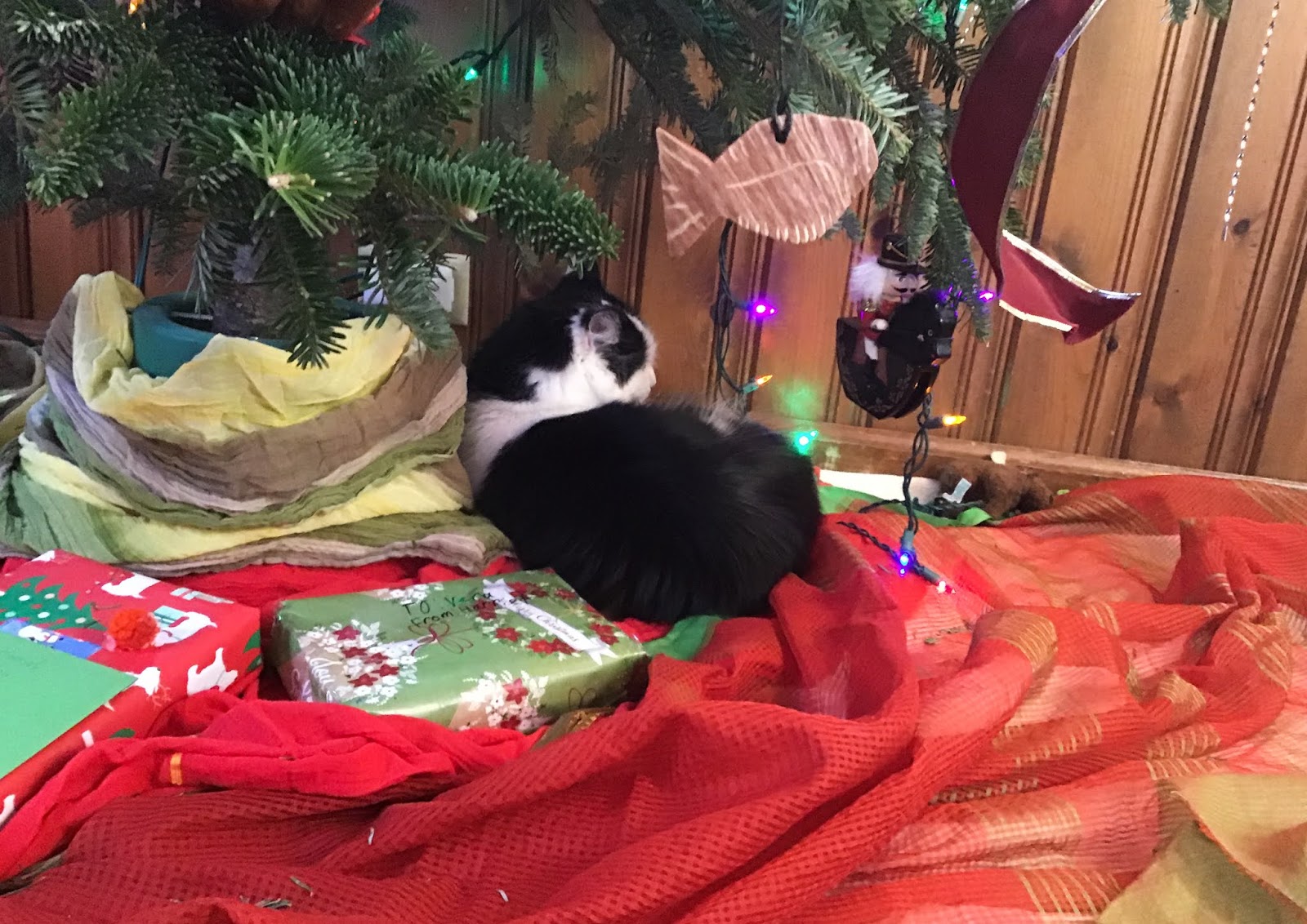I'll welcome in the new year with this snuggle image: Salvatore snuggling up close to the tree, in this little nook on the right hand side. When he wasn't there, our other cat Veronica liked to snuggle in this same spot also.